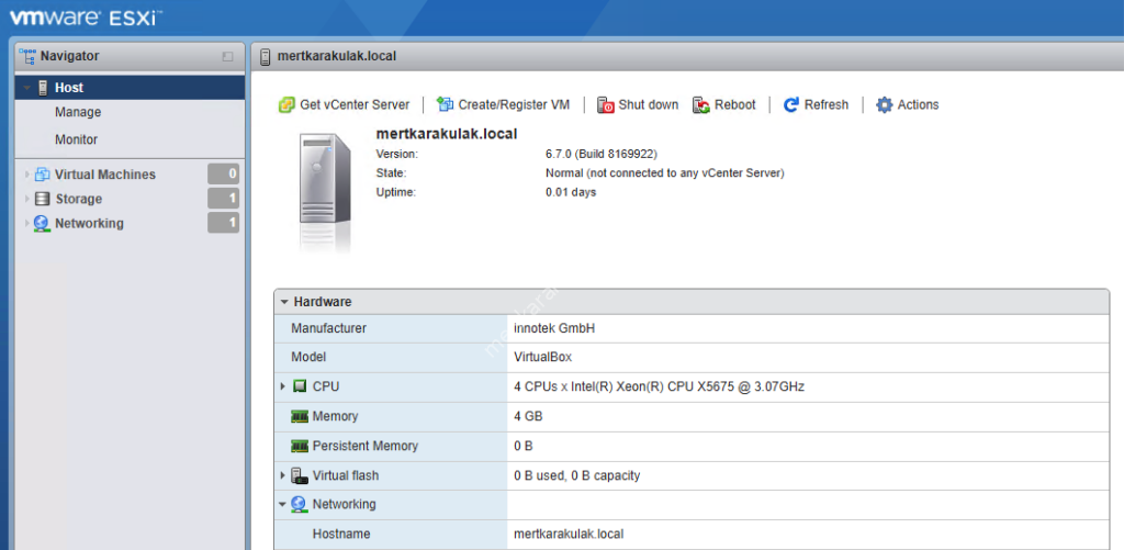 Giriş yaptıktan sonra otomatik olarak karşınıza gelecek olan “Host Detail” ekranı sizi karşılayacaktır. Bu aşamada sunucu hakkında temel bilgileri tek bir ekranda görüntüleyebilirken, sağ tarafta konumalan menü üzerindende VM yönetiminizi, Storage yönetimlerinizi ve Network Card yapılarınızı düzenleyebilirsiniz.
