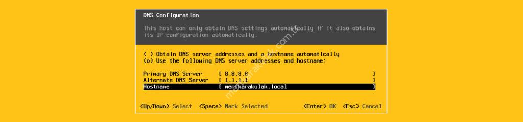 DHCP server üzerinde herhangi bir DNS tanımlı değil veya bir nedenden dolayı networkünüz üzerinde herhangi bir DHCP sunucusu bulunmuyor ise sabit bir DNS adresi tanımlamak için “Use the fallowing DNS server addresses and hostname” seçilir ve hemen ardından “Primary DNS Server”, “Alternate DNS Server” ve “Hostname” alanları doldurularak Enter tuşuna basarak yapılan işlemler kayıt edilir. Yukarıdaki gibi tekrardan yapılan değişikliklerin hemen geçerli olabilmesi için network yönetim servisine restart etmek gerekebilir.